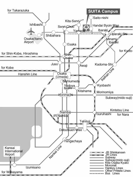 Line (via Ibaraki on JR Line) to Handai-Honbu-Mae, walk 5-15 min.